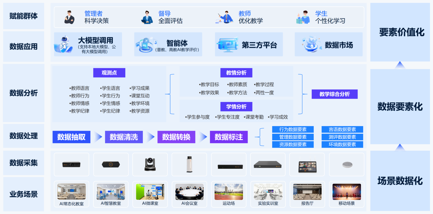 AI 課堂數(shù)據(jù)要素方案圍繞“場景數(shù)據(jù)化、數(shù)據(jù)要素化、要素價值化”三大核心展開。從業(yè)務(wù)場景出發(fā),通過數(shù)據(jù)采集、處理、分析與應(yīng)用,賦能管理者科學(xué)決策、教師優(yōu)化教學(xué)、學(xué)生個性化學(xué)習(xí)以及督導(dǎo)全面評估,以數(shù)據(jù)要素驅(qū)動課堂發(fā)展。
