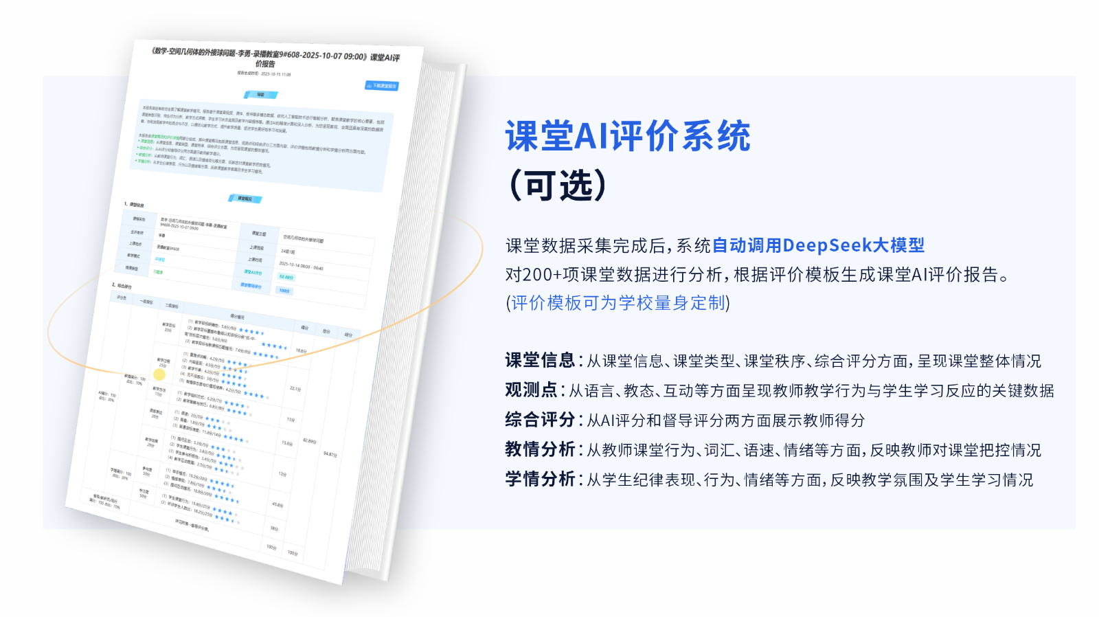 對200+項(xiàng)課堂數(shù)據(jù)進(jìn)行分析,根據(jù)評價模板生成課堂AI評價報告。